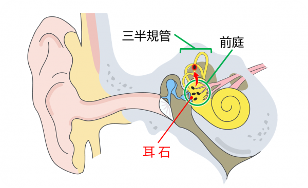 この病気の原因は、耳の奥にある耳石(じせき)という砂のような結晶が本来あるべき場所から外れてしまったことにより起こります。頭を動かす動作をすると、外れた結晶が内耳の三半規管の中を動き回り、それがバランスの神経を刺激してめまいが起こります。