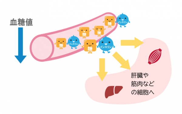インスリンは膵臓のβ細胞から分泌されるホルモンで、血液中のブドウ糖を筋肉や脂肪、肝臓の細胞に取り込ませる働きを持ちます。血糖を下げるホルモンはインスリンしかありません。